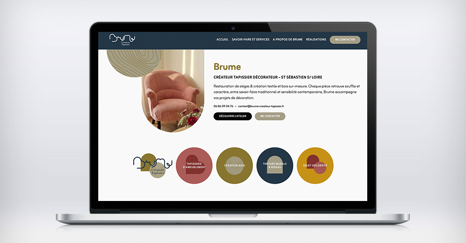 Début 2026 j'ai réalisé le site internet de Brume, un atelier de tapisserie d'ameublement situé à St Sébastien sur Loire (44). Le site est construit sur WordPress, un projet réalisé de la conception à la réalisation. L'utilisation de Figma a été privilégiée dans les phases de conception, des wireframes, du prototypage et pour les maquettes. Charte grahique et logo était préalablement fournis par le client.